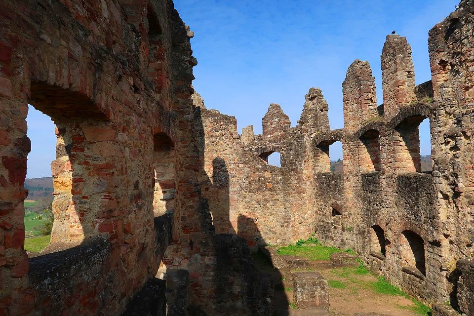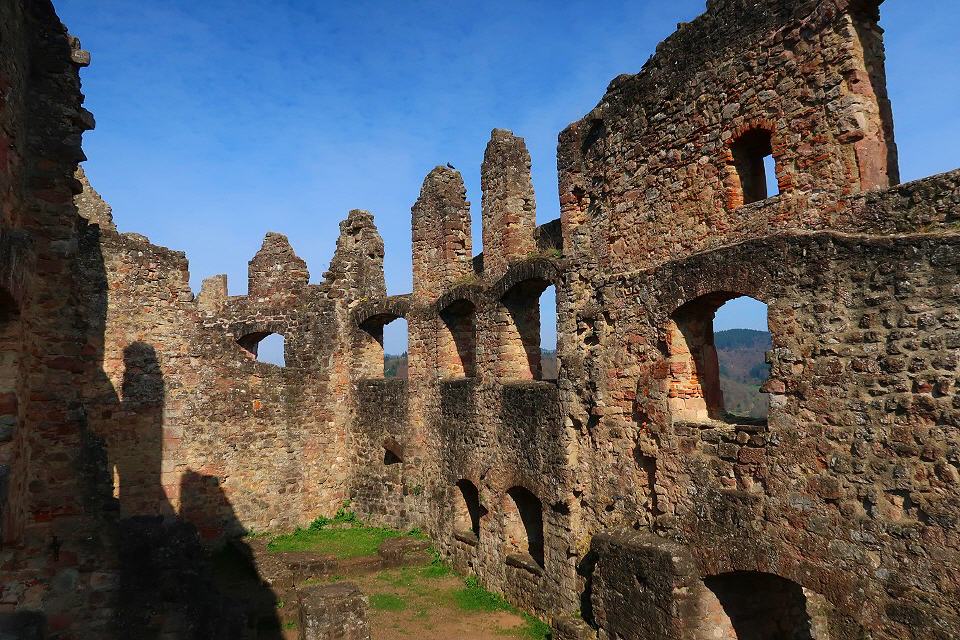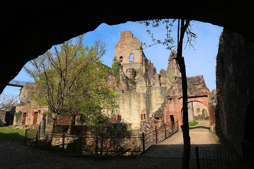 Nun sind es nur noch 450 m bis zur südlichen Bastion der Hochburg. Über eine Treppe und einen dunklen Mauerdurchgang kann man sie durchqueren. Beim Besuch der weitläufigen Anlage, die die zweitgrößte Burg Badens nach dem Heidelberger Schloss ist, empfiehlt es sich, auf die Färbungen der Mauerquader und auf die an vielen Stellen erschlossenen anstehenden Sandsteinschichten zu achten.