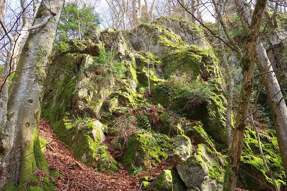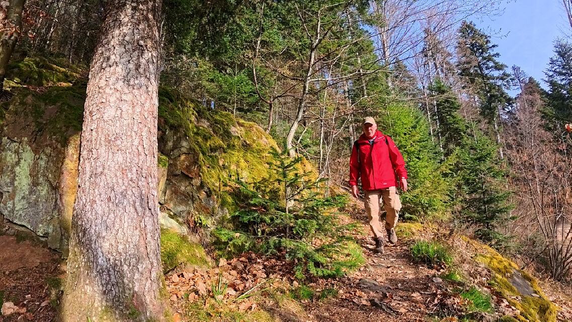 Station 7: Der Verlauf des Urgrabens vom 22 km entfernten Platten am Osthang des Kandel hatte seinen Grund, denn auf dieser Seite des Bergmassives fehlte das benötigte Wasser. An diesem Standort führt der heutige Wanderweg exakt auf der Trasse des ehemaligen Wassergrabens - und dieser musste damals kunstvoll um die Felsvorsprünge herumgeführt werden. Die Breite des Urgrabens betrug maximal einen halben Meter.