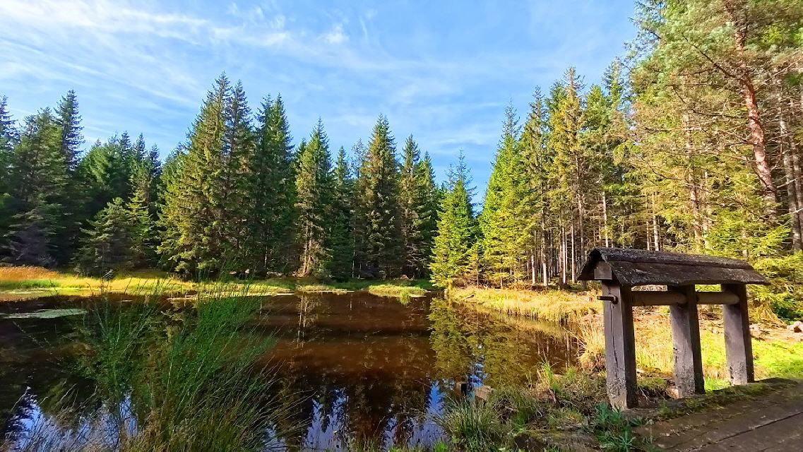 Start ist beim Strandbad am Klosterweiher in Friedenweiler, wo der Klosterbach angestaut ist. Dort den Bach queren und ansteigend in den Kosterwald wandern. Wir sind auf dem Kirchweg und kommen an einem Gedenkkreuz vorbei. Nach etwa einem Kilometer, sobald wir den Anstieg überwunden haben, vom Kirchweg rechts in die Elisabethen-Allee abbiegen. Der Forstweg führt schnurgeradeaus, bis wir nach ca. 2 km rechts ein Forsthaus erreichen, bald darauf links abbiegen. Nach wenigen 100 Metern erreichen wir den Floßbachweiher. Der Klosterwald ist von zahlreichen Forstwegen in Karrees eingeteilt. Der Wald lieferte viele Jahre lang das Scheitholz für die Stuben der Donaueschinger.