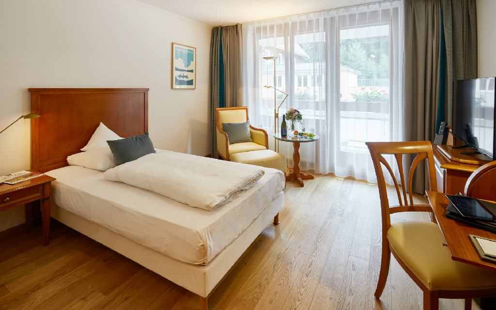 Einzelzimmer Zartenbach. Einzelzimmer 18 qm, kein Balkon, Nord-Westseite. Ein kleines, feines Wohlfühl-Refugium für Alleinreisende. Der gemütliche Rückzugsraum besticht durch seine natürliche Farbgebung und die hochwertige Innenausstattung. Das große Einzelbett (100 x 200 cm) verspricht erholsame Nächte mit allem Komfort.