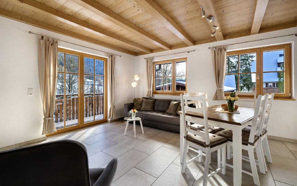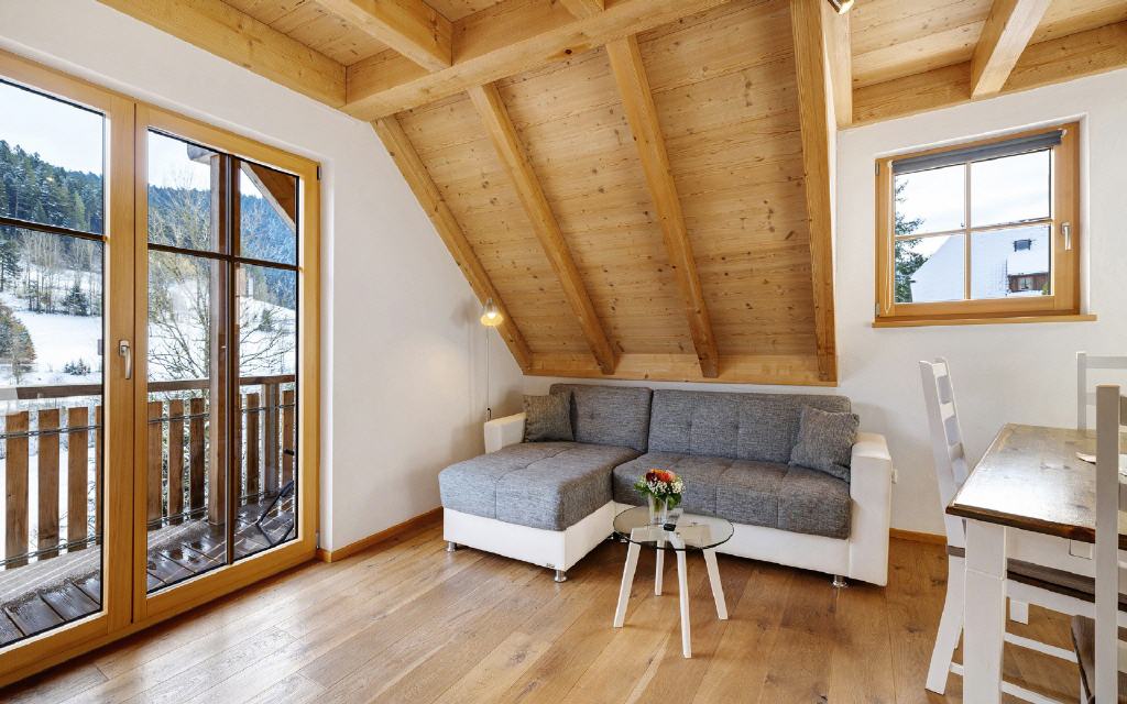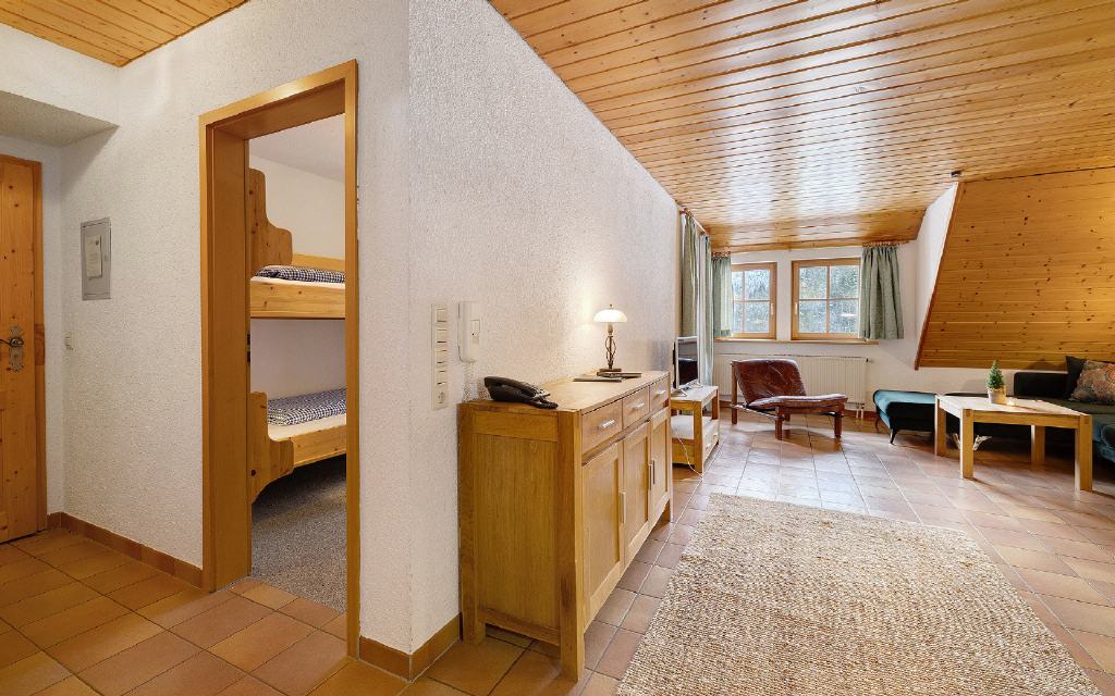 Ferienwohnung Flößerstuben: Separates Kinderzimmer, einen großen Wohn-Essraum mit Balkon und Küche, der nach oben hin zur Schlafgalerie offen ist, bei der sich auch das Badezimmer befindet. Größe ca. 80 qm. Preis 105 Euro (pro Nacht ab 4 Übernachtungen).