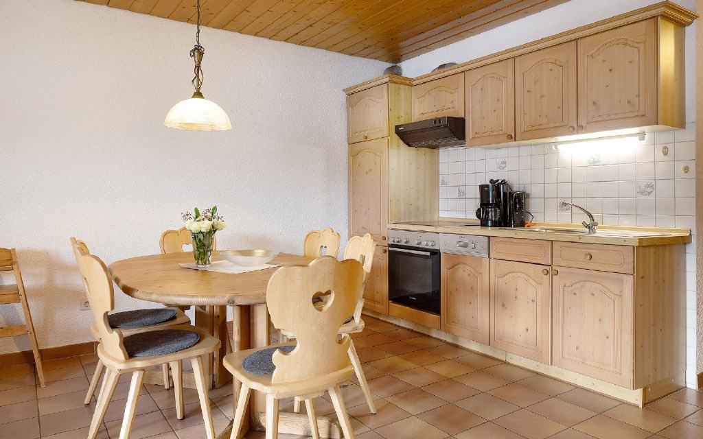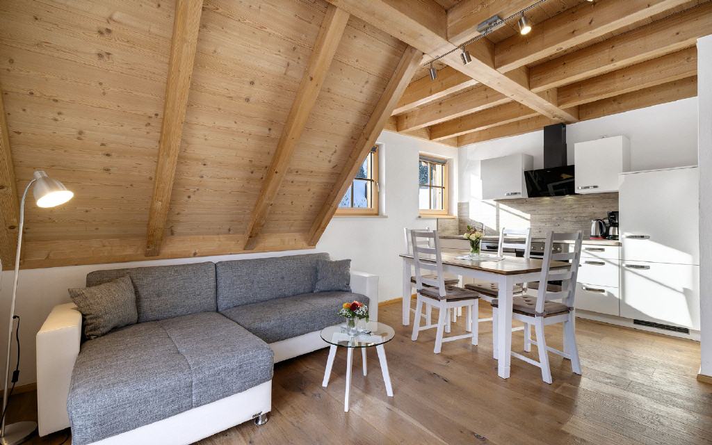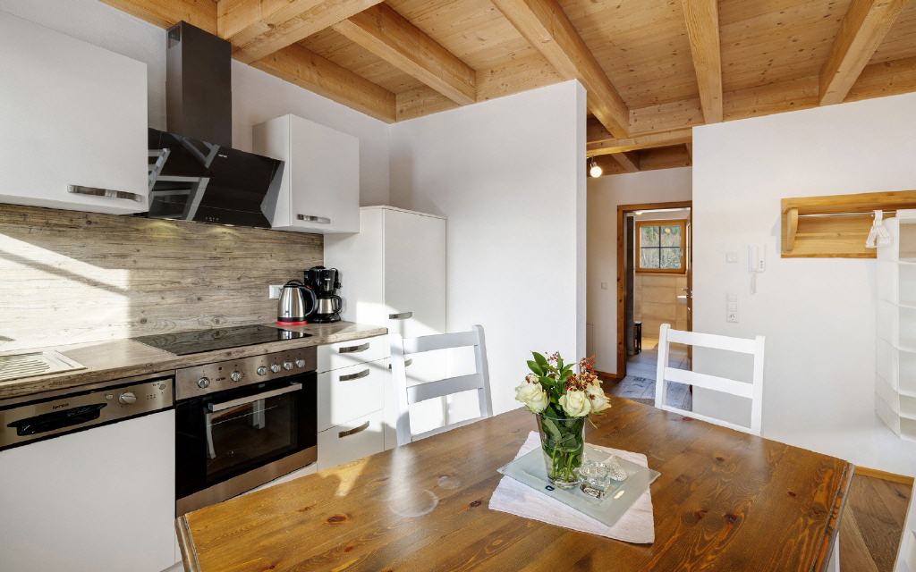 Ferienwohnung Buchbachstuben: Wohn-Essraum mit Balkon und Küchenzeile, der ebenfalls nach oben hin zur Schlafgalerie offen ist, bei der sich auch das Badezimmer befindet. Größe ca. 55 qm. Preis 80 Euro (pro Nacht ab 4 Übernachtungen).