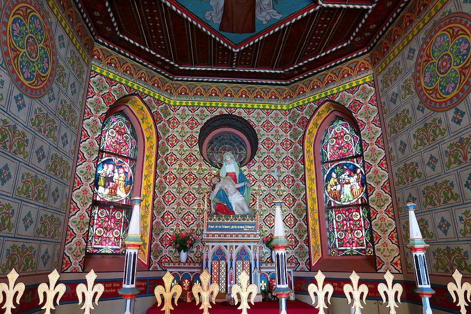 So markant die Kapelle über dem Dreisamtal und insbesondere am Eingang zum Wagensteigtal thront, so beeindruckend ist auch ihre Innenausstattung. Besonders auffallend sind die farbigen Glasfenster.