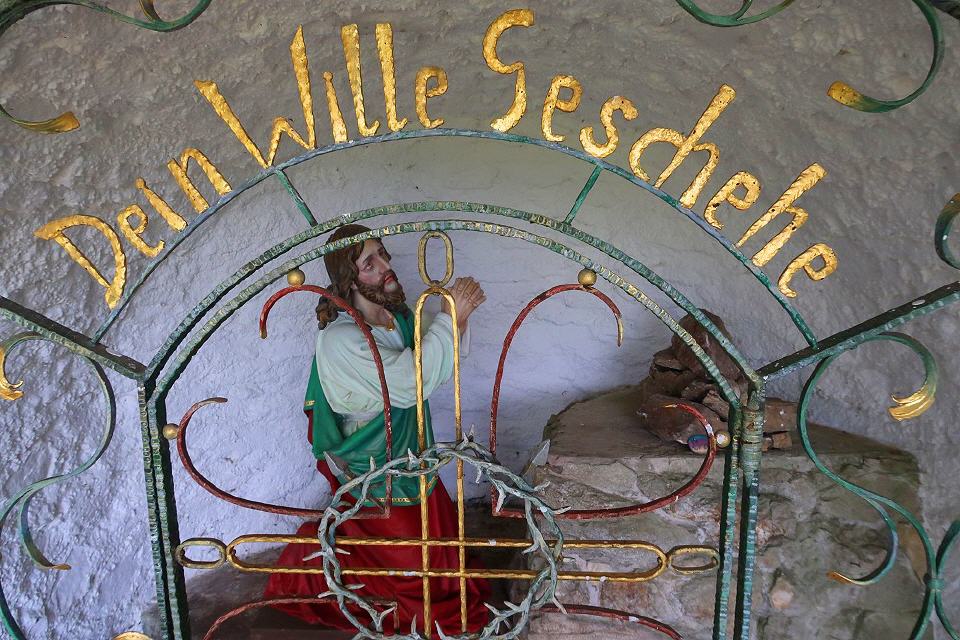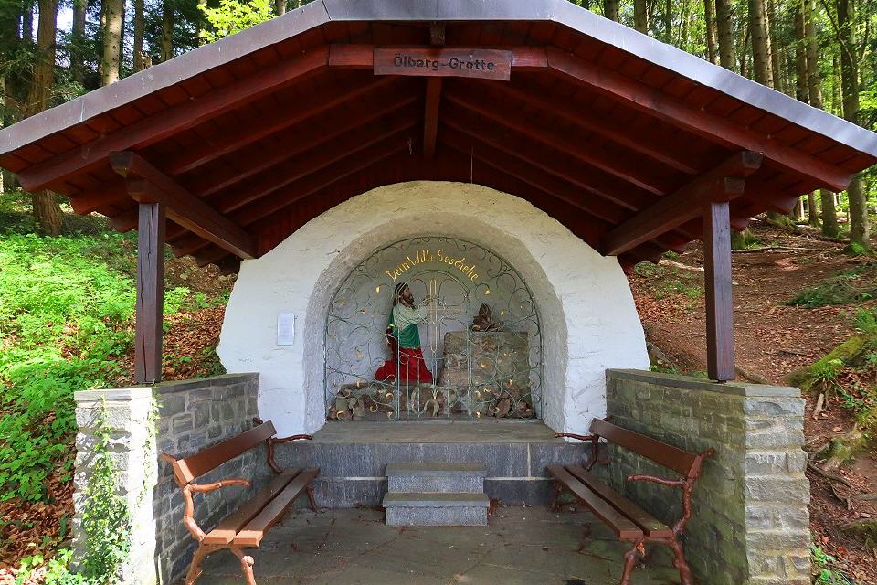 Die Hafnerhofbäuerin Theresia Volk und der Dorfpfarrer Störk kamn 1887 überein, am Wallfahrtsweg eine Ölberggrote zu errichten. Franz Simmler aus Offenburg wurde beauftragt, eine Christusstatue aus Kiefernholz zu schaffen. Am 14. Juli 1889 war feierliche Einweihnung. Waldameisen und Feuchtigkeit zerstörten jedoch das Werk. Im Winter 1896 / 97 wurde von Kochendörfer aus Waldkirch eine Kopie aus Vogesensandstein erstellt. Am 21. März 1897 weihte Pfarrer Fuchs das Bildnis ein. Eine unbekannte Frau spendete kurze Zeit später eine Engelsskulptur mit Kelch. In der Pandemie wurde dieser schöne Engel von Unbekannten geköpft. Eine Restauration scheint nicht geplant zu ssein. Der Engel kehrte also nicht an seinen Platz zurück.