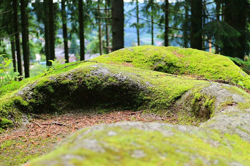 4. Altarstein. Wir blicken zu diesen Stein hinauf. Der Felsen ruht erhaben auf einem großen Granitblock. Er kann fast rundum begangen werden. Wäre hier kein Wald angepflanzt, läge dem Betrachter Schonach zu Füßen. Aufgrund seiner außergewöhnlichen Lage kommt ihm besondere Bedeutung zu. Der Stein enthält westlich eine Sitzschale und talseitig drei stufenförmig angeordnete Wasserschalen mit einem Auslauf.