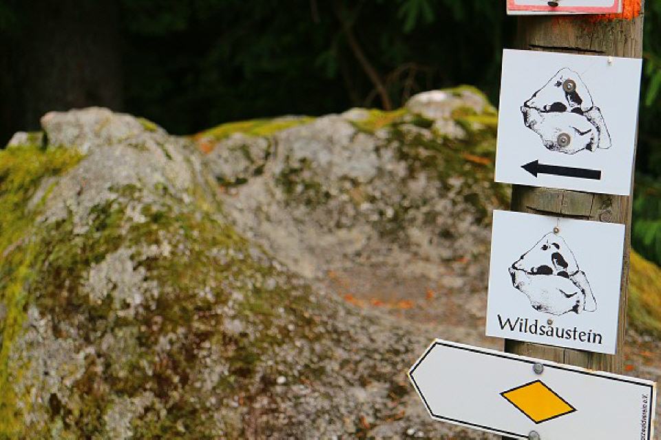 7. Wildsaustein. 300 Meter westlich vom Eulenstein ist der Holzeck erreicht. Der Asphaltstraße folgend stoßen wir zu einem der schönsten Aussichtspunkte um Schonach. In dieser aussichtsreichen Lage steht der Wildsaustein. Der Stein gleicht seinem namensgebenden Tier. Auf der Oberseite ist eine 65 cm große Schale mit breitem östlichen Auslauf zu finden. Dieser Stein dient auch als Grenzstein. In unmittelbarer Nähe am Waldrand lädt eine Sitzbank zum Rasten ein und bietet einen schönen Ausblick auf die Schwarzwaldlandschaft.