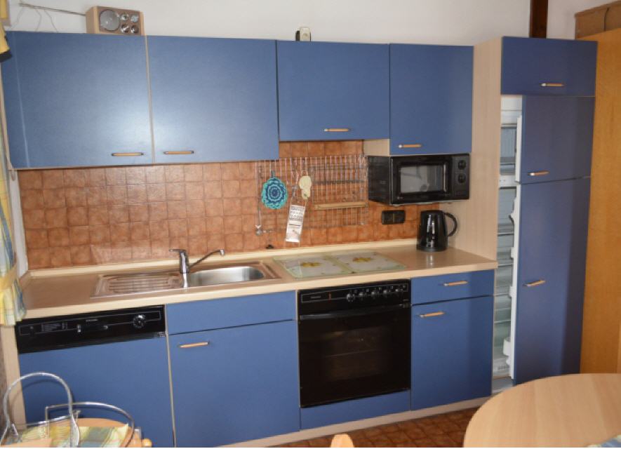 - Küche: Töpfe, Geschirr und Besteck, Kaffeemaschine, Eierkocher, Ceranherd, Mikrowelle, Mixer, Waffeleisen, Küchenwaage, Kuchenform für Muffins, Backofen, Spülmaschine, Kühlschrank mit Gefrierfach, Wasserkocher, Toaster, Sandwichtoaster, Kaffeepadmaschine