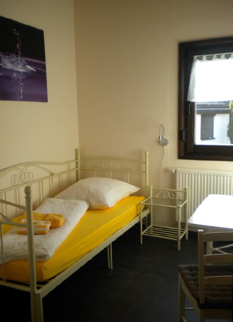 - Einzelzimmer: Bett mit Decke und Kissen, Schrank, kleiner Tisch mit 2 Stühlen, Rolladen zur Verdunklung