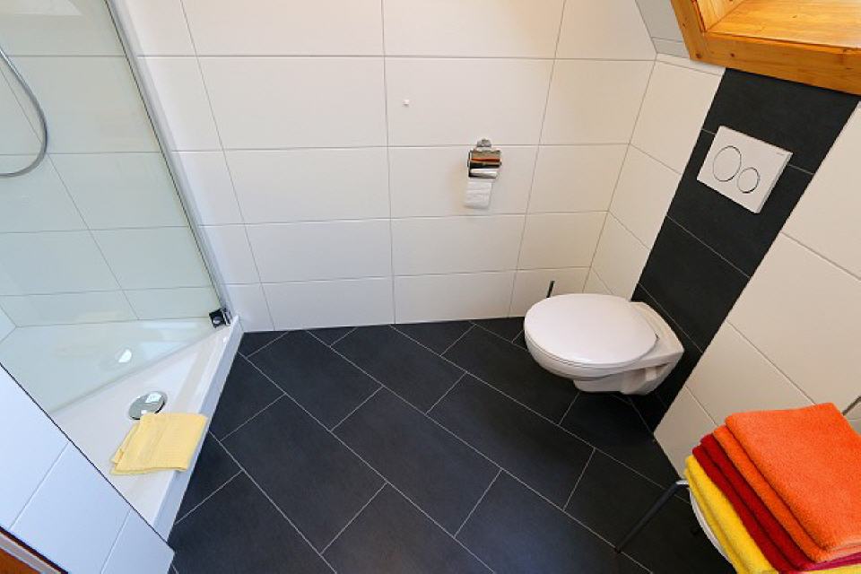 Bad/Dusche, WC, Föhn, Kosmetikspiegel.