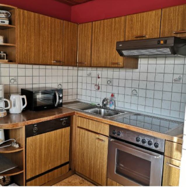 Komplette Einbauküche (Spülmaschine, Ceran-Kochfeld, Backofen, Kühl-Gefrierkombination, Mikrowelle, Kaffeemaschine und Senseo Pad Maschine, Wasserkocher, Toaster, Eierkocher) mit gemütlicher Essecke für die ganze Familie