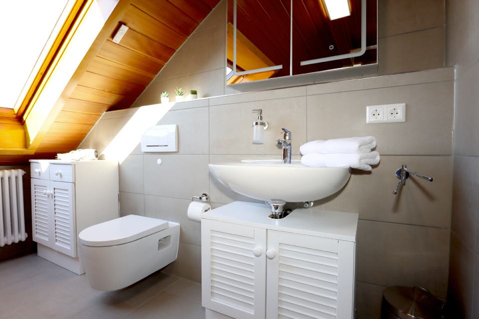 - Sanitär: großes Badezimmer, WC, Dusche, Waschbecken, Spiegel, Fön