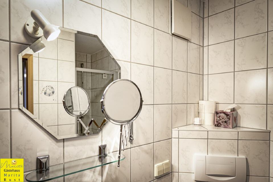 Sanitär: Bad mit Dusche, Waschbecken, Spiegel, Handtuchablage, Fön, Kosmetikspiegel, WC
